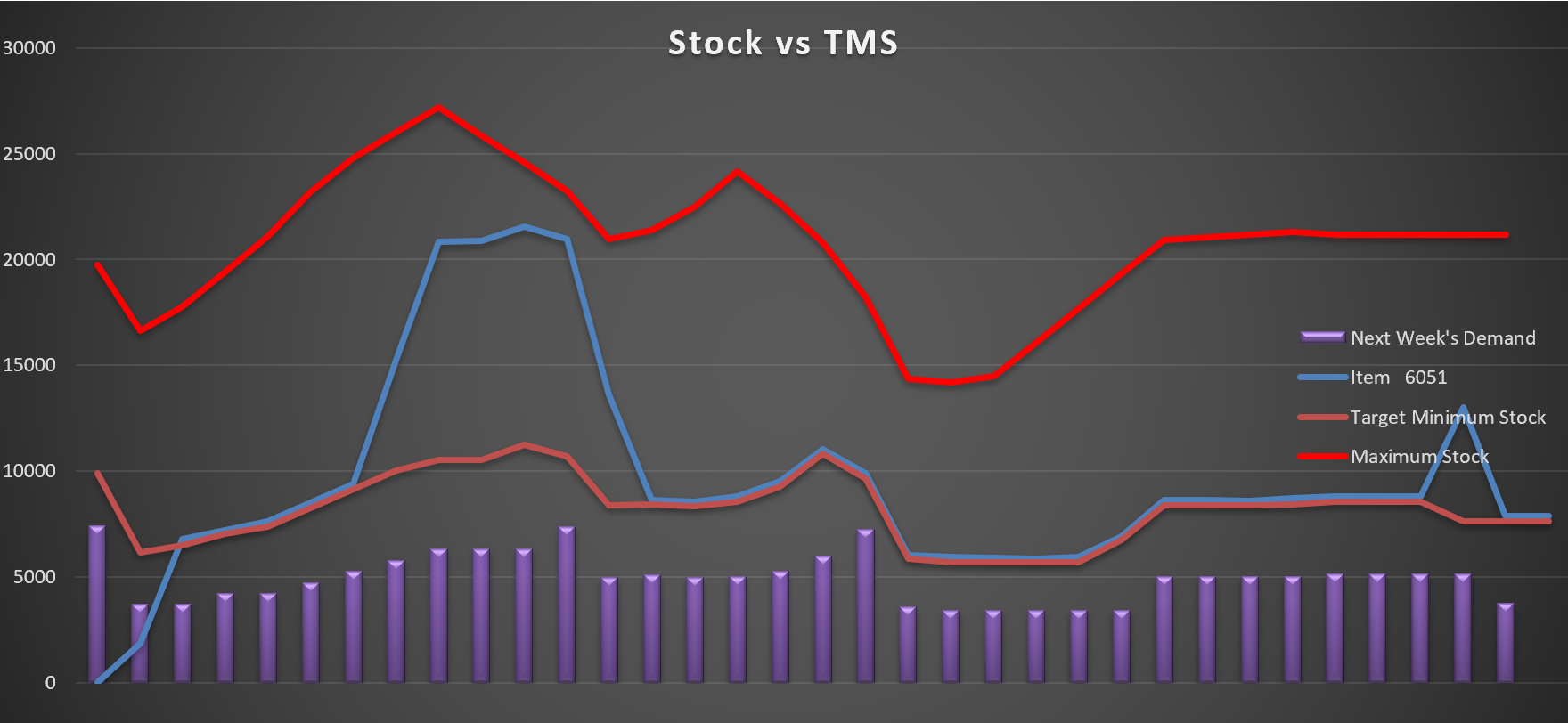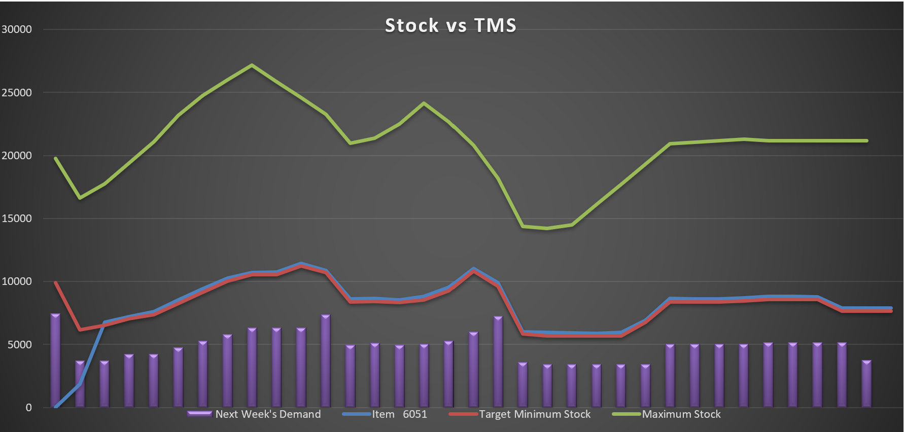 Fig. 1 Inventory results from an initial plan using dynamic minimum and maximum stocks. Item 6051
