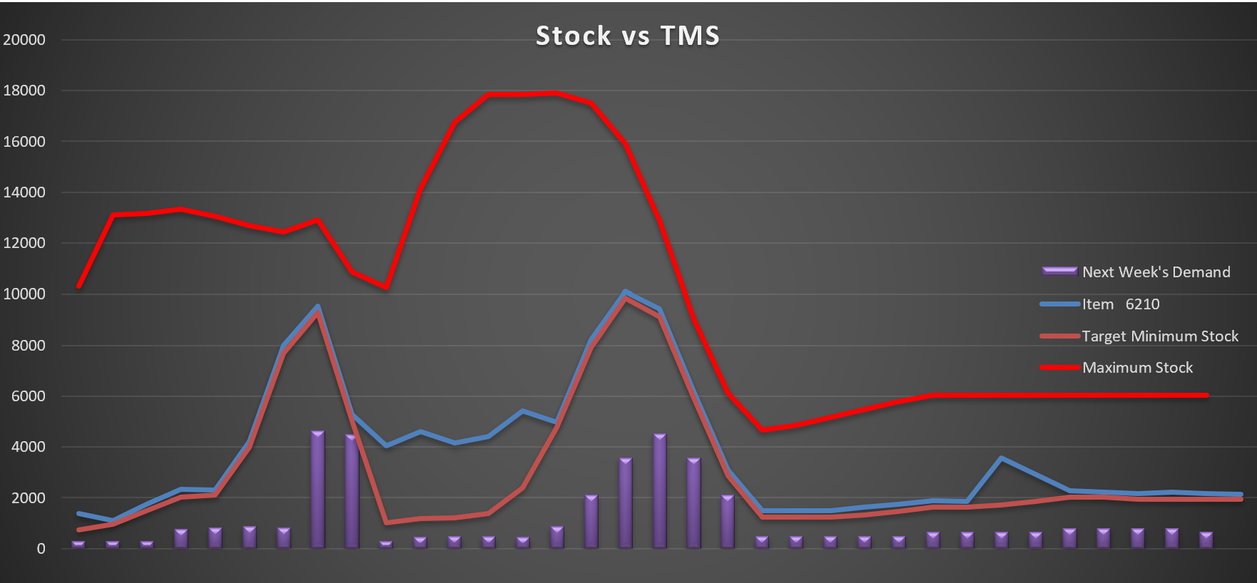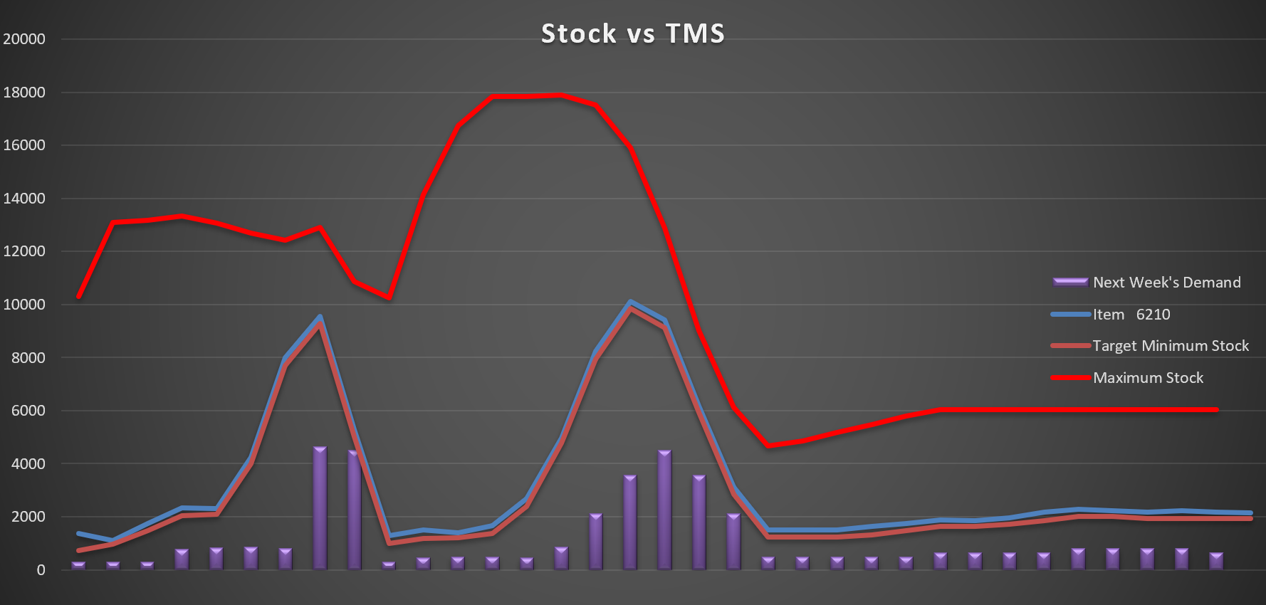 Fig. 2 Inventory results from an initial plan using dynamic minimum and maximum stocks. Item 6210 - a much more variable SKU